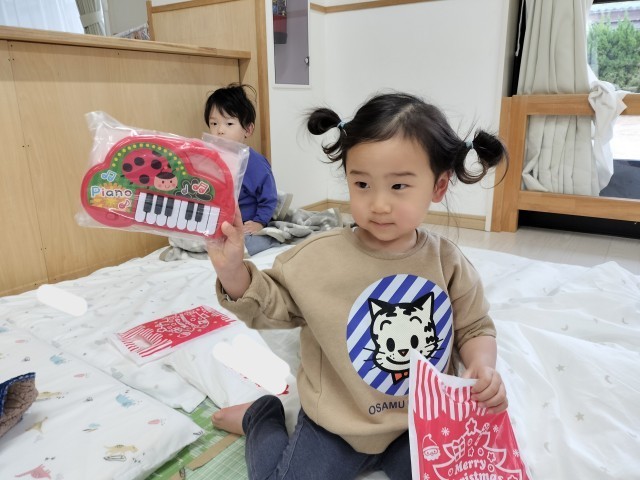 起きた時の子どもたちは・・・「うわぁ~!!」「プレゼントだ~!!」「先生見て見て!」と、とっても大喜び!!