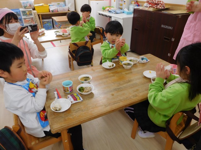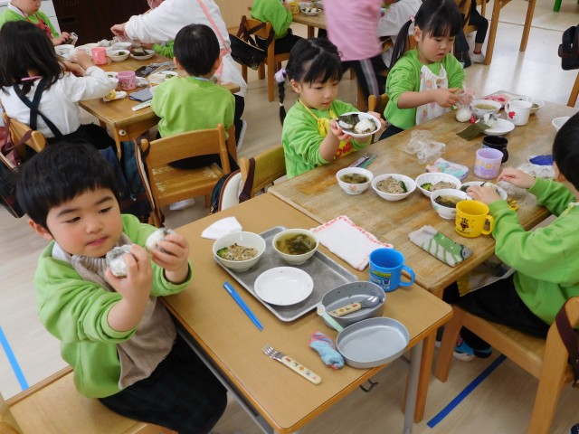 お弁当タイムはみんなニコニコ!!「美味しい~!!」と、みんなが美味しそうに食べていましたよ!準備ありがとうございました。